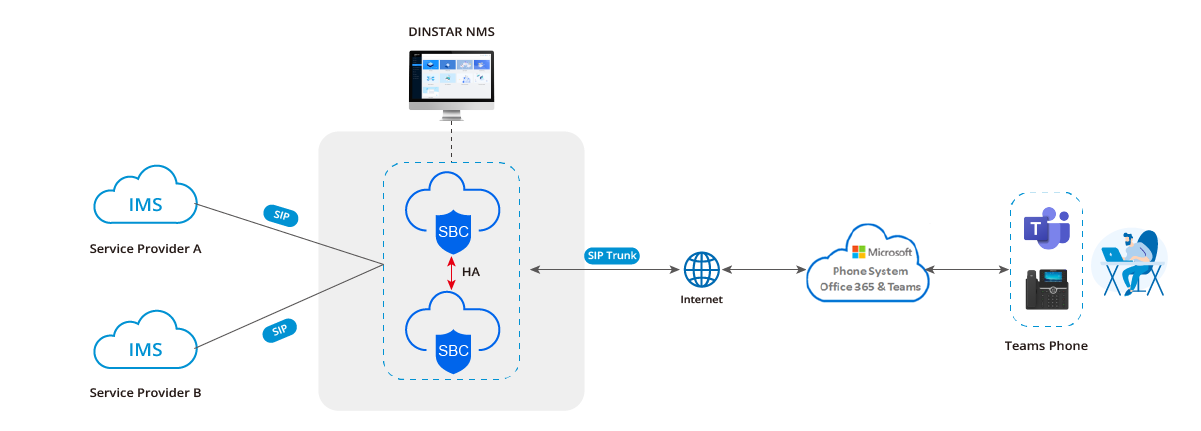 Совместимость и совместимость: Различные SIP-серверы и SIP-транки могут демонстрировать различия в совместимости. DINSTAR SBC способствует взаимосвязи и совместимости различных платформ, обеспечивая бесперебойную связь. Безопасность: SBC повышает безопасность, предоставляя голосовые брандмауэры и шифруя сигнализацию и мультимедиа. Это обеспечивает безопасность голосовой связи, защищая от потенциальных вредоносных атак через Интернет. Плавная миграция: Предприятия часто выбирают постепенный переход на Teams, продолжая использовать традиционные АТС и IP-АТС во время перехода. DINSTAR SBC обеспечивает бесшовное соединение между пользователями Teams и старой АТС в этот переходный период. Гибкость и отказоустойчивость: DINSTAR SBC предлагает широкий спектр резервирования. Это гарантирует, что ваша система сможет поддерживать нормальное соединение даже в случае непредвиденных инцидентов, обеспечивая гибкость, аварийное переключение и отказоустойчивость.Почему стоит выбрать DINSTAR SBC?