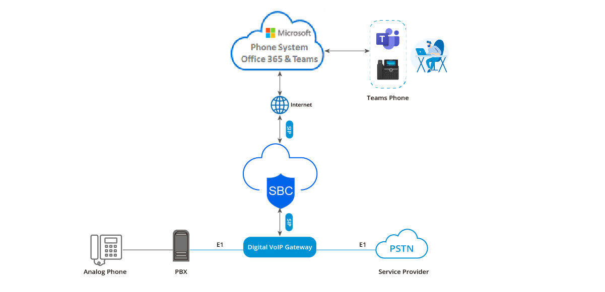 (1) Используйте магистральный/медиашлюз для подключения локальной АТС и магистральной линии E1 оператора, сохраняя существующие операторские линии и аналоговых пользователей. (2) Магистральный/медиашлюз подключается к DINSTAR SBC, а затем SBC подключается к Microsoft Teams, облегчая взаимодействие между Teams и локальной традиционной АТС предприятия. (3) Исходящие звонки Teams: Звонки, инициированные в Teams, направляются через DINSTAR SBC, а затем перенаправляются на местную линию E1 для исходящих вызовов. (4) Звонки между добавочными номерами УАТС и пользователями Teams: УАТС перенаправляет вызов на магистральный/медиашлюз по линии E1. Затем магистральный или мультимедийный шлюз перенаправляет вызов в SBC, а SBC направляет его в Teams, обеспечивая беспрепятственное взаимодействие между аналоговыми расширениями и пользователями Teams. (5) Методы входящих и исходящих вызовов системы АТС остаются неизменными, привычки набора номера существующих пользователей АТС на предприятии не изменяются.