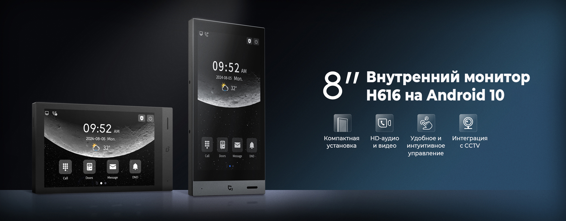 H616 — это настоящая универсальная панель, органично сочетающая функции домофона, надёжную домашнюю безопасность и передовую домашнюю автоматизацию. Её тщательный дизайн — с изящным, обтекаемым краем и прочной алюминиевой панелью — обеспечивает как эстетическую привлекательность, так и прочность. Монитор оснащён ярким 8-дюймовым IPS-сенсорным экраном, который обеспечивает чёткую и чёткую графику и служит центральным центром управления вашей системой умного дома.