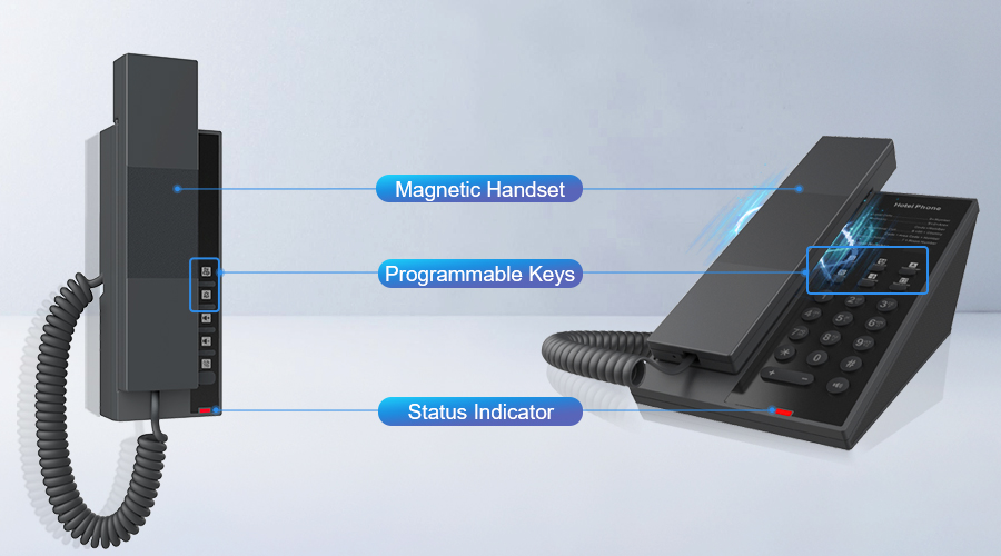 Все модели оснащены программируемыми клавишами (например, для «Стойки регистрации» или «Не беспокоить») для обслуживания гостей одним щелчком мыши. Магнитная трубка обеспечивает аккуратное размещение, а многоцветный светодиодный индикатор состояния мгновенно сообщает о ключевых состояниях, таких как входящие вызовы, пропущенные вызовы, непрочитанные сообщения и режим «Не беспокоить».