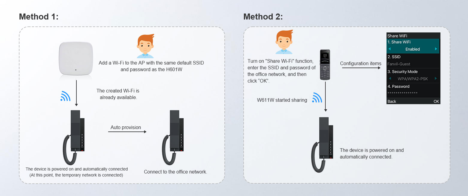Модели H601W и H602W оснащены встроенным модулем Wi-Fi 2,4 ГГц/5 ГГц с поддержкой Wi-Fi 6. На каждое устройство предварительно загружены SSID и пароль по умолчанию, что позволяет развертывать технологию Plug-and-Play без прокладки кабелей, что значительно сокращает время настройки сети и трудозатраты.