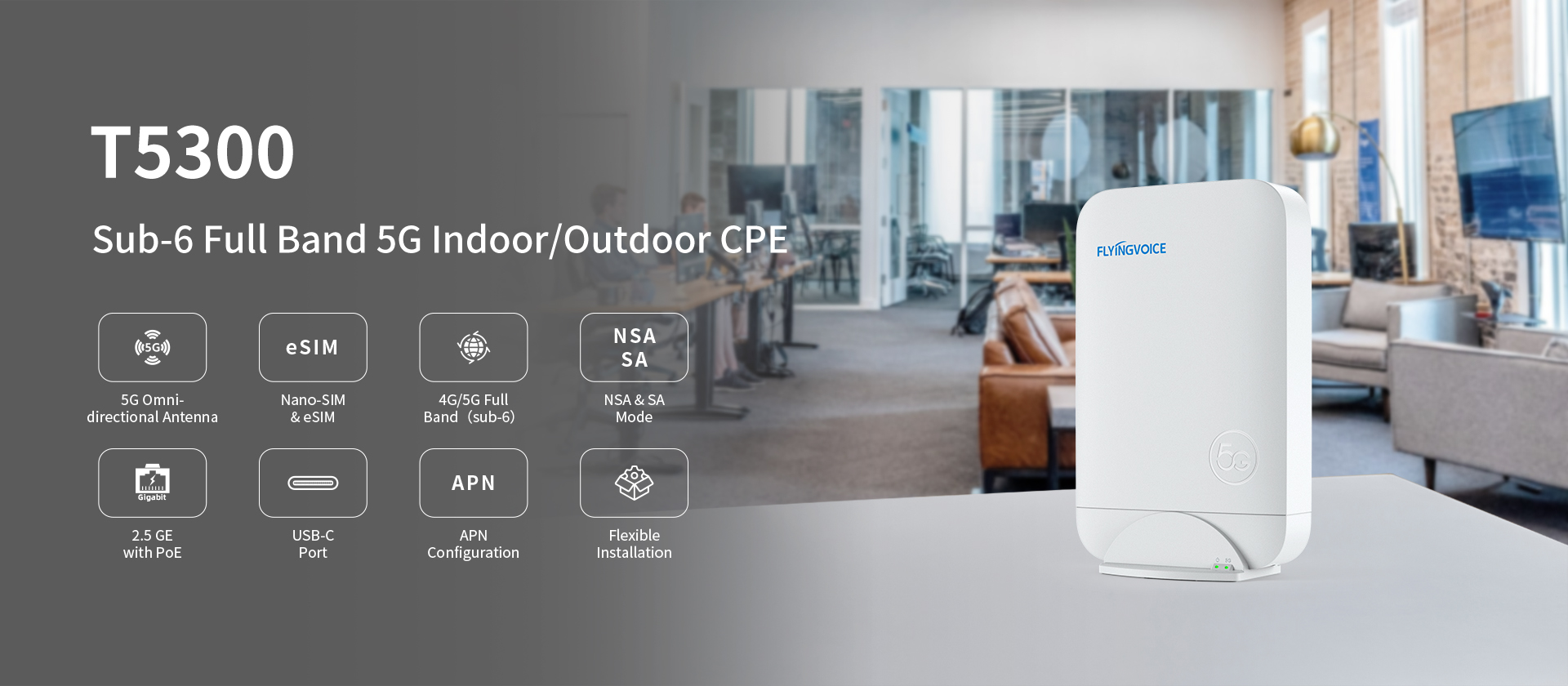 [Шэньчжэнь, 19 апреля 2024 г.] – Высокотехнологичная компания Flyingvoice, специализирующаяся на терминальных продуктах VoIP и продуктах 5G FWA, рада объявить о выпуске своего новейшего продукта T5300. T5300 — это широкополосный абонент 5G Sub-6 для помещений и вне помещений, который сочетает в себе передовые технологии с исключительным дизайном для обеспечения непревзойденного качества связи для пользователей.