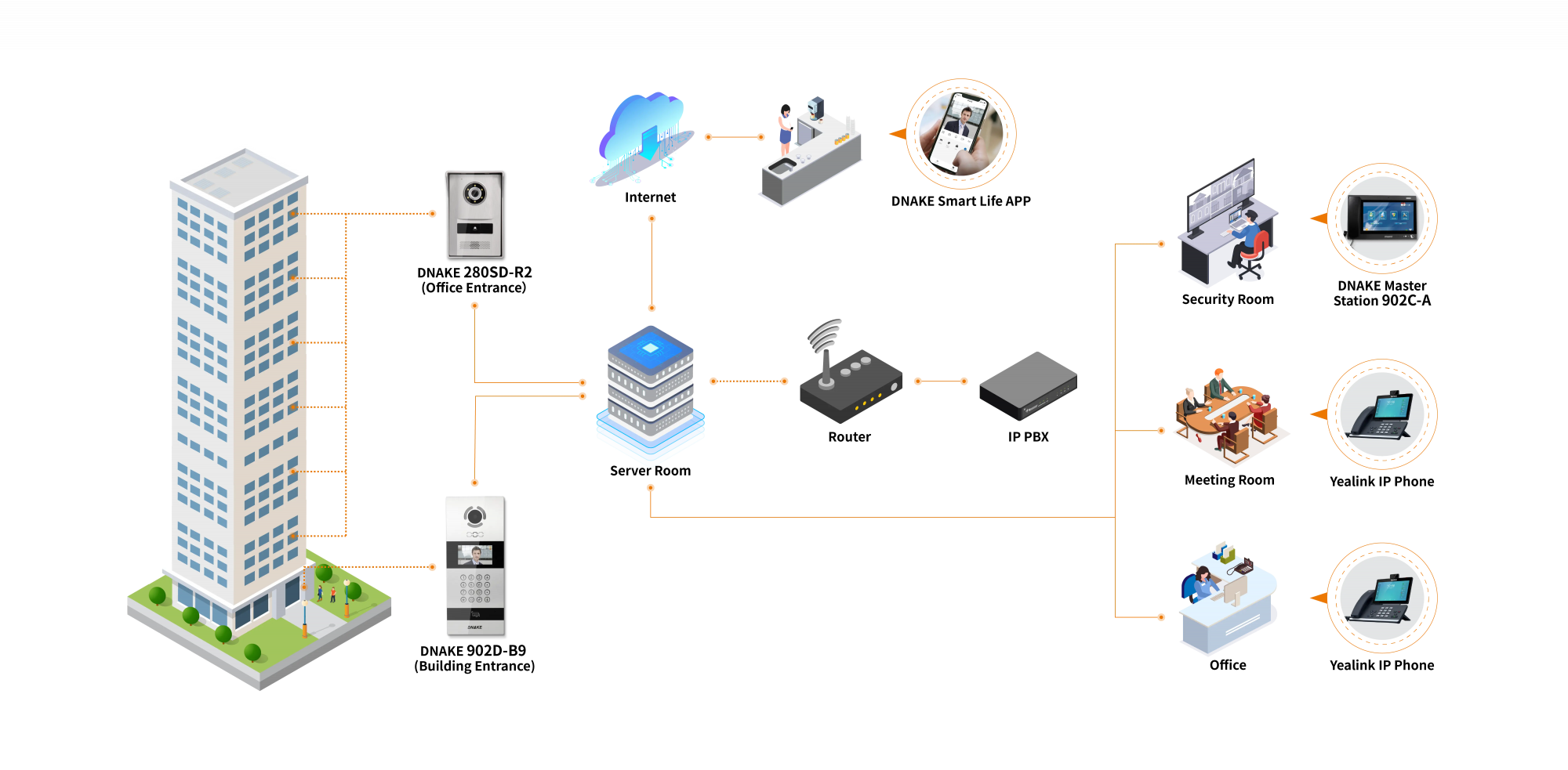 В качестве устройства входа в дверь используются IP-видеодомофоны DNAKE для управления входом в дверь. Интеграция с IP-телефонами Yealink позволяет видеодомофонной системе DNAKE SIP принимать телефонные звонки, как и IP-телефоны. Посетители нажимают на видеодомофон DNAKE IP, чтобы позвонить, после чего администраторы или операторы SEM принимают звонок и открывают дверь для посетителей. Теперь клиенты SEM могут легче управлять и получать доступ к входу с большой гибкостью и повышенной производительностью.